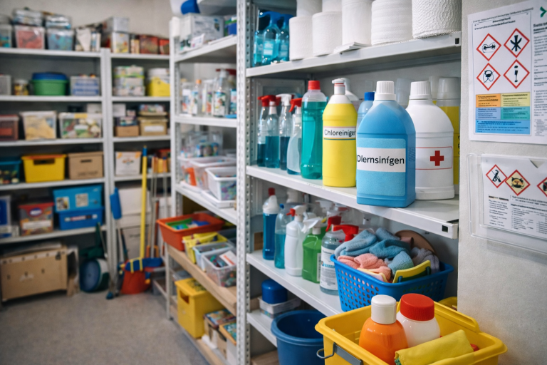 Bewertung der Lagerung von Reinigungs- und Arbeitsmitteln im Hinblick auf Sicherheit, Ordnung und gesetzliche Anforderungen.