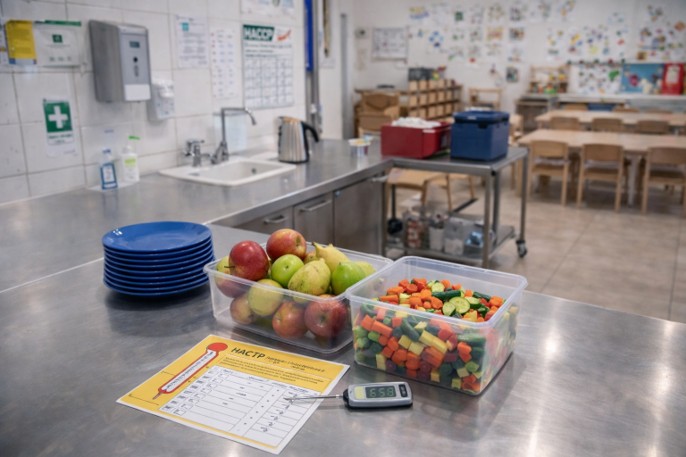 Überprüfung hygienerelevanter Abläufe bei Essensausgabe, Zubereitung, Lagerung und Reinigung im Küchen- und Essensbereich.