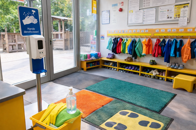Analyse hygienischer Risiken im Bring- und Abholbereich sowie in Garderoben, inklusive Ordnung, Reinigung und Trennung sauber/unrein.