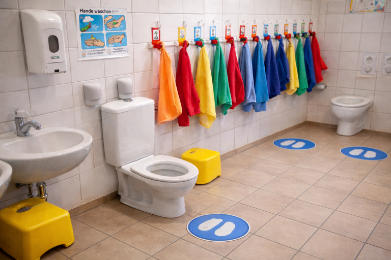 Bewertung der Sanitärbereiche für Kinder mit Fokus auf Sauberkeit, Ausstattung, Nutzungskonzepte und Infektionsprävention.